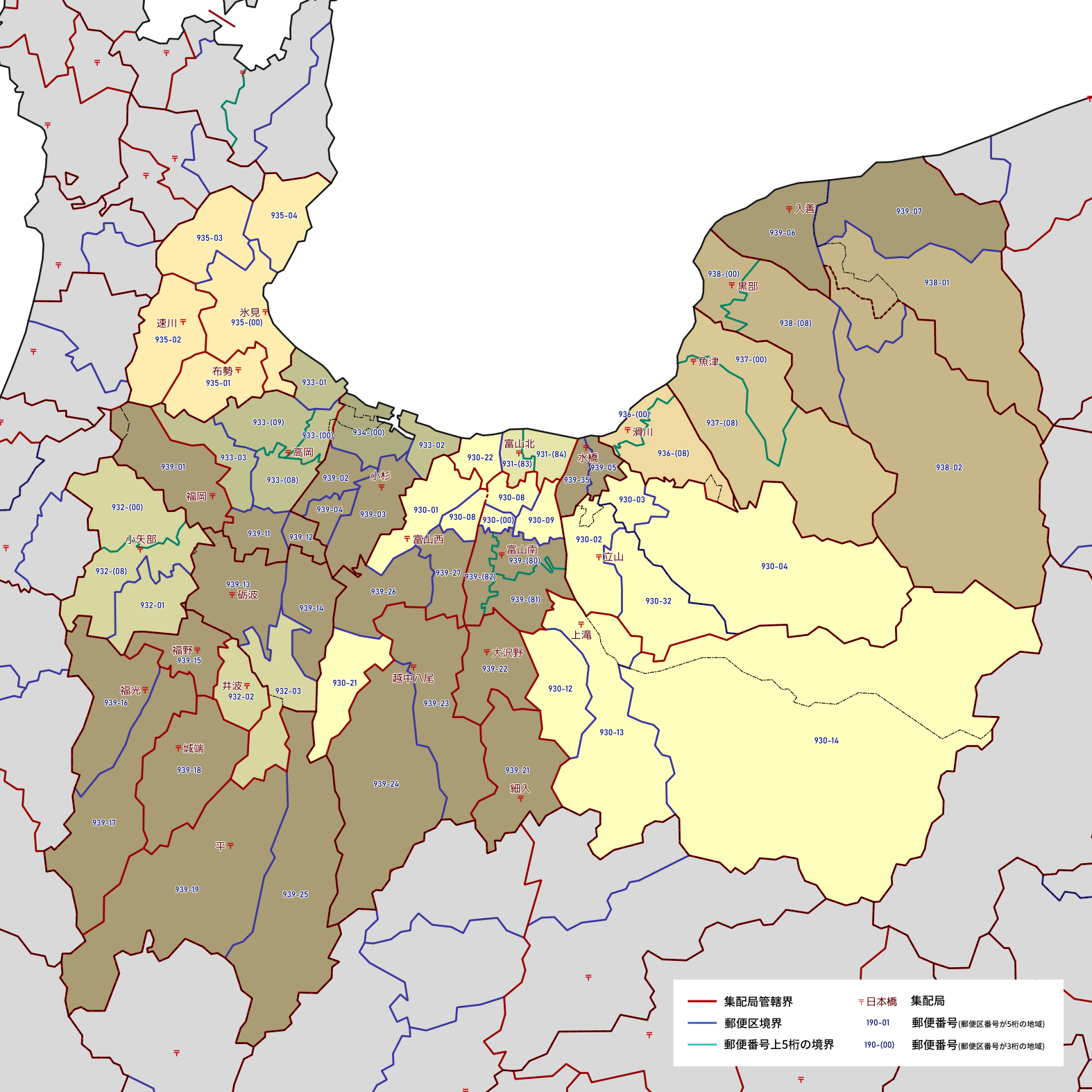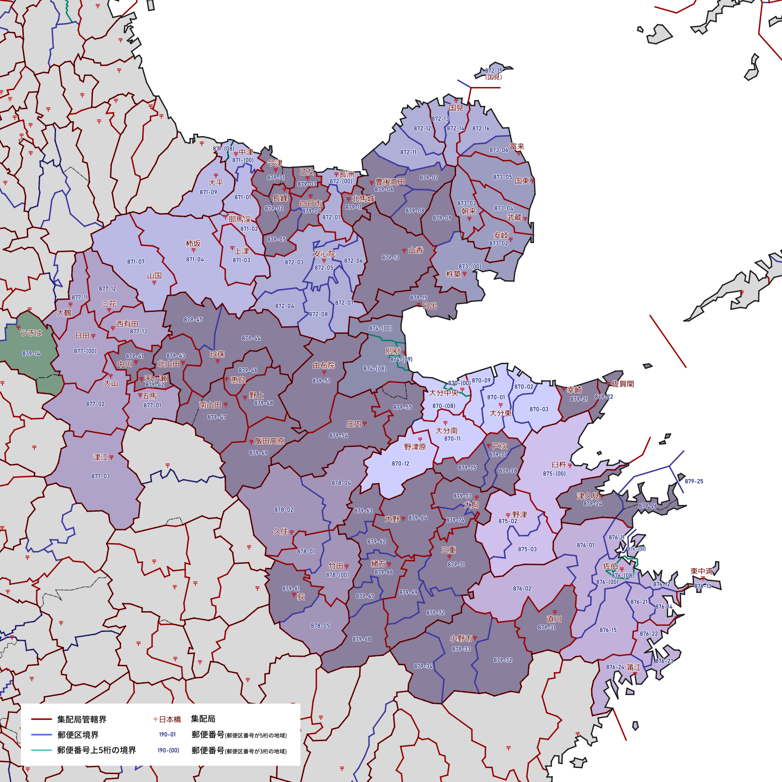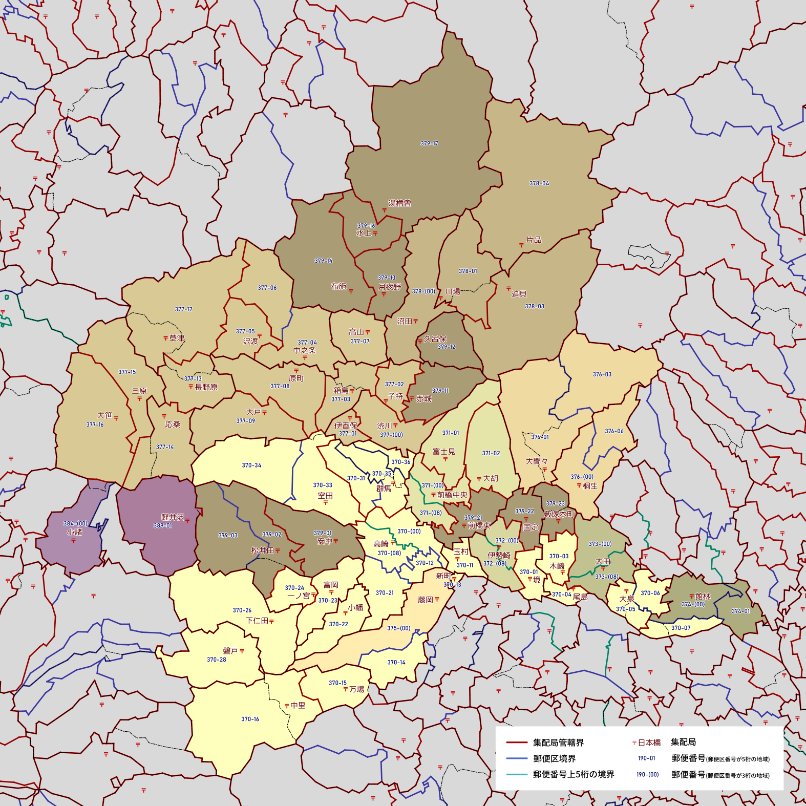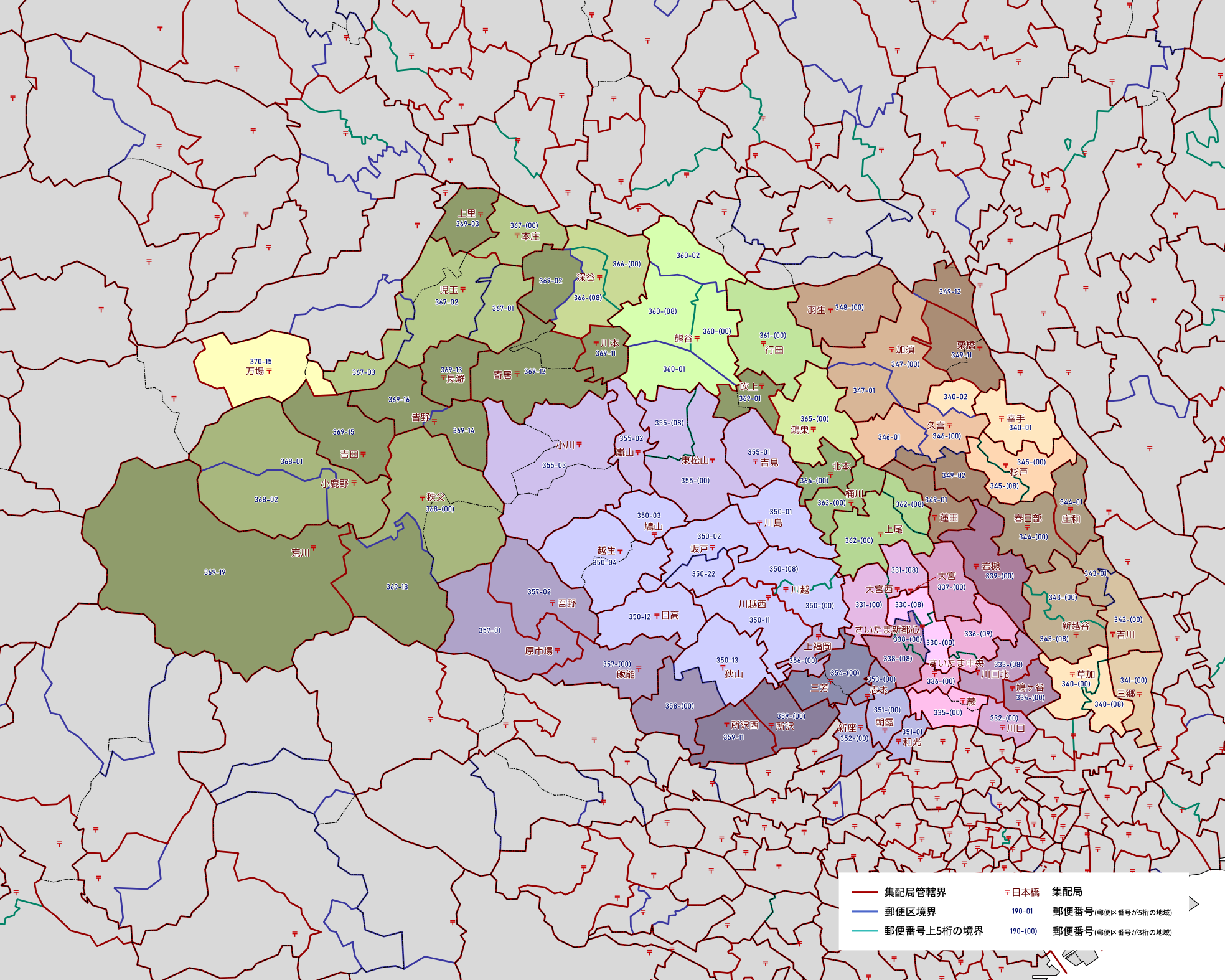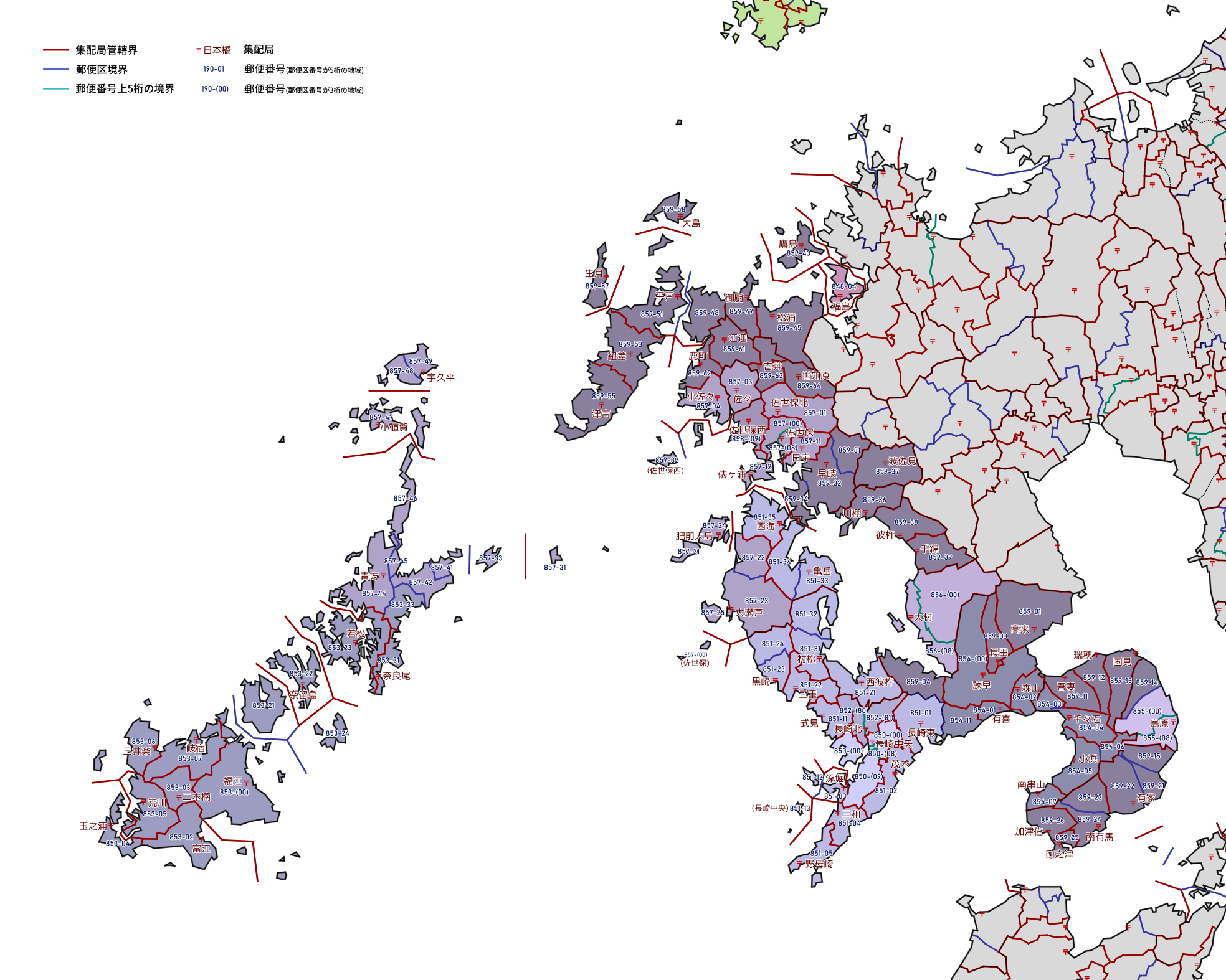 郵便番号の上5桁ごとに区分した都道府県別の地図です。