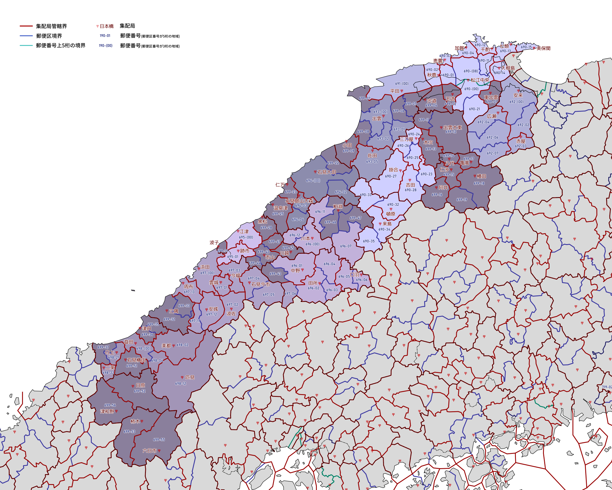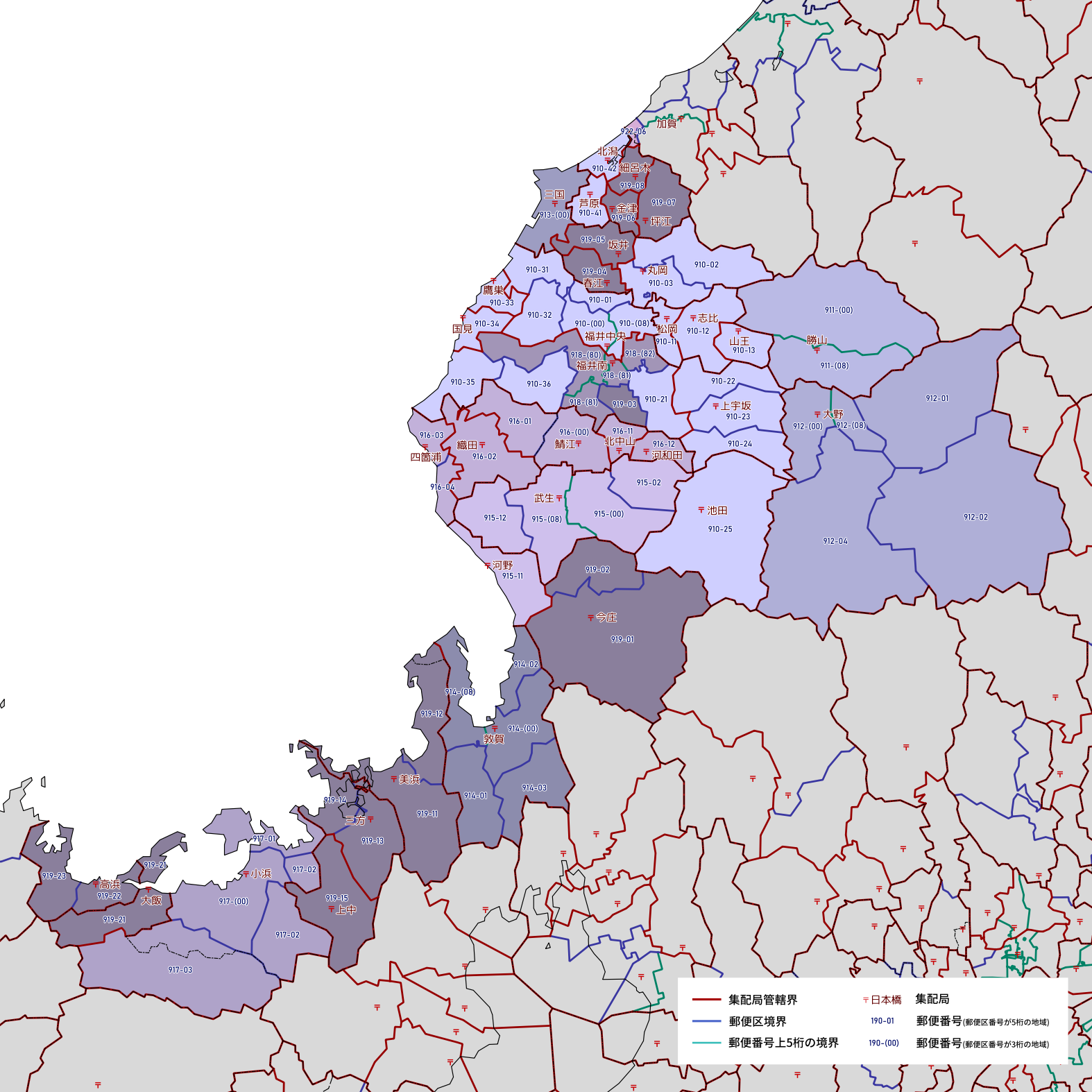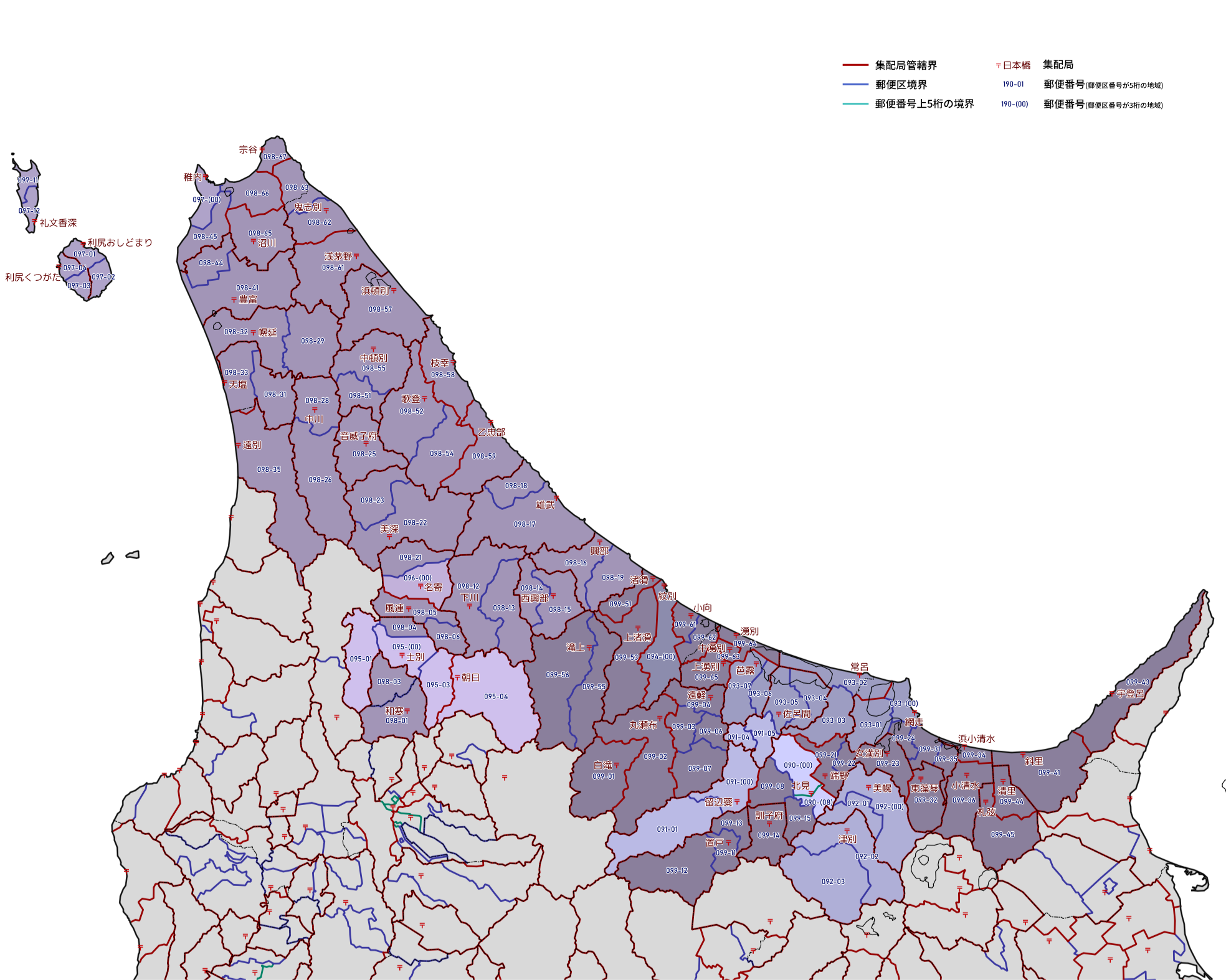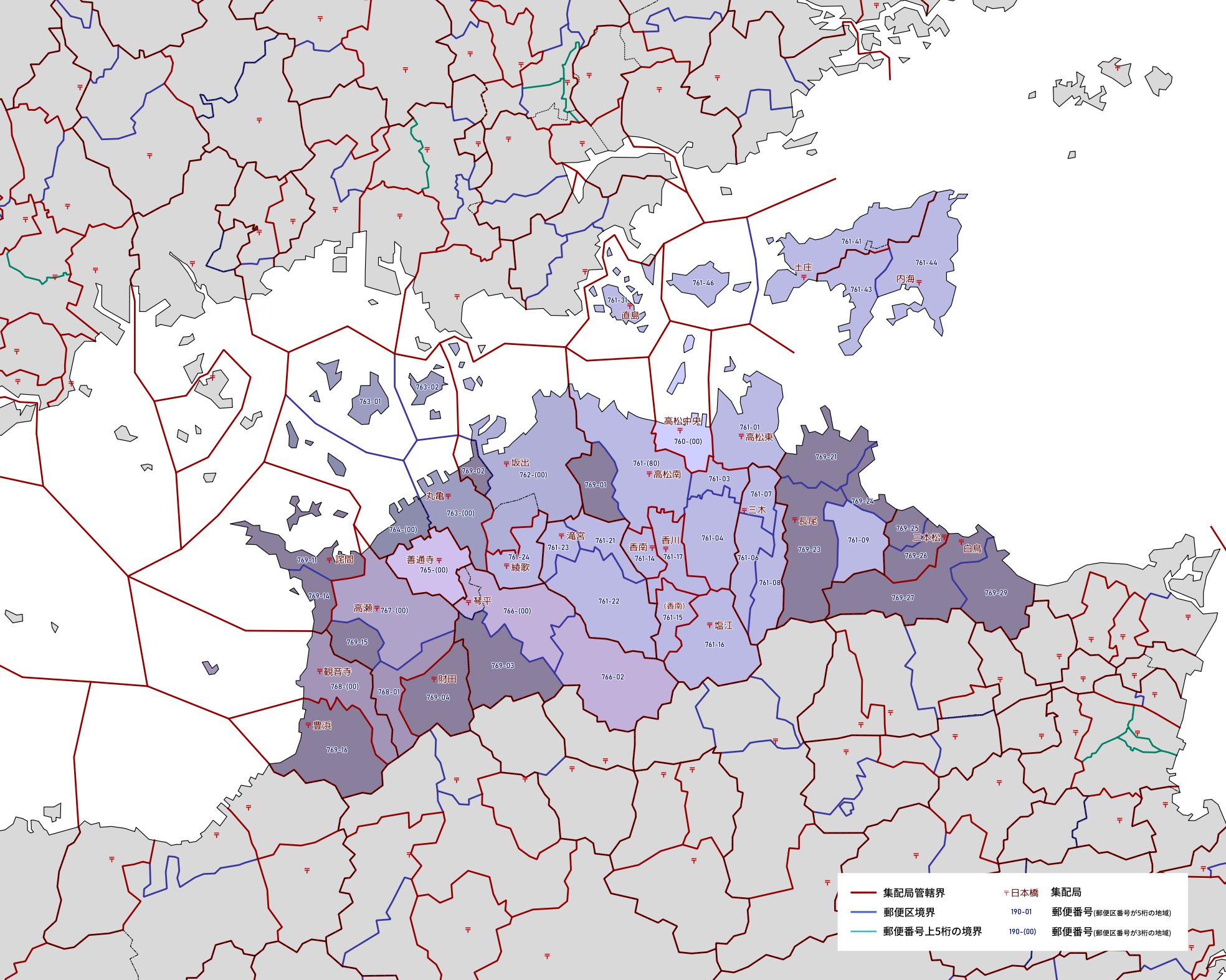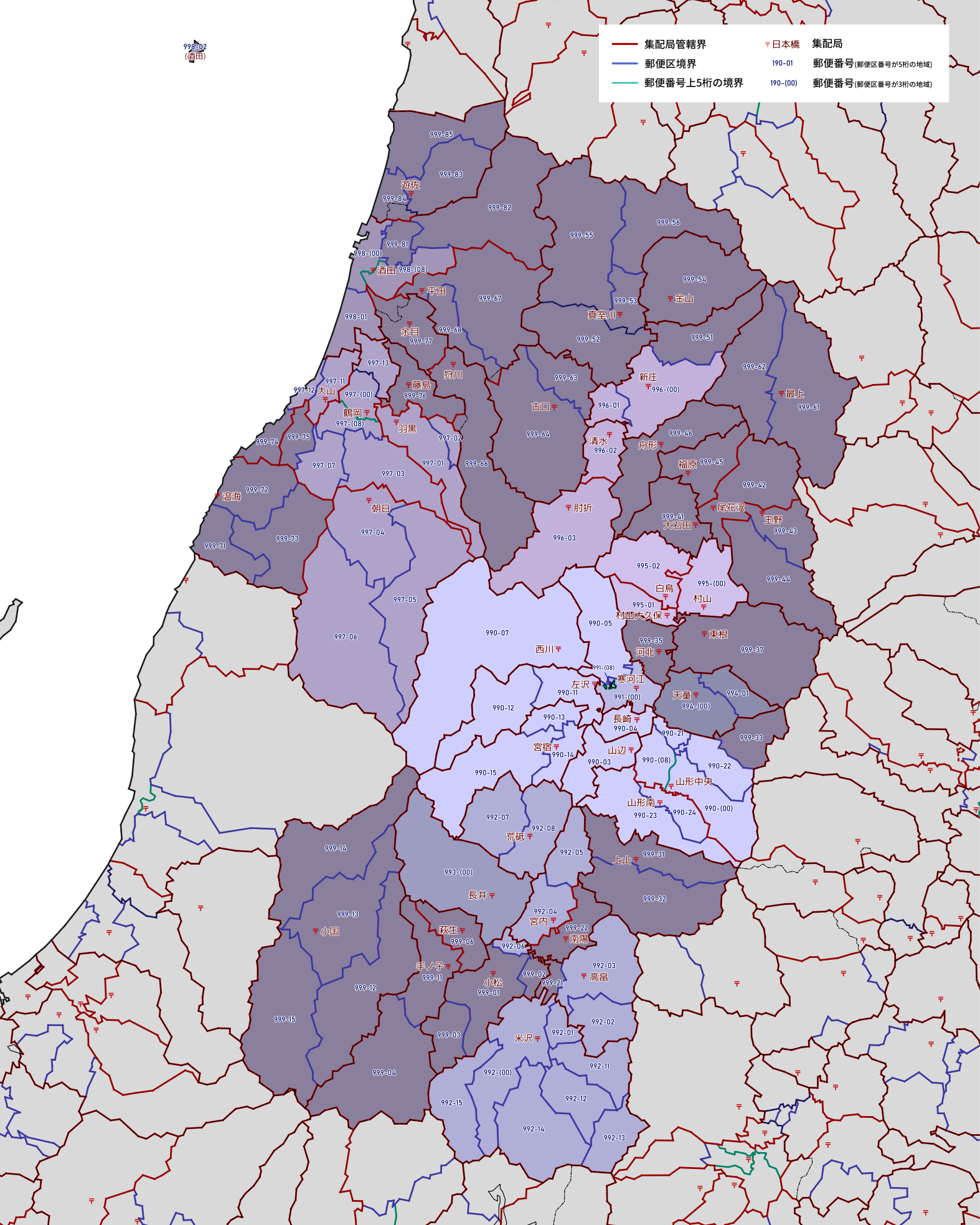 郵便番号の上5桁ごとに区分した都道府県別の地図です。