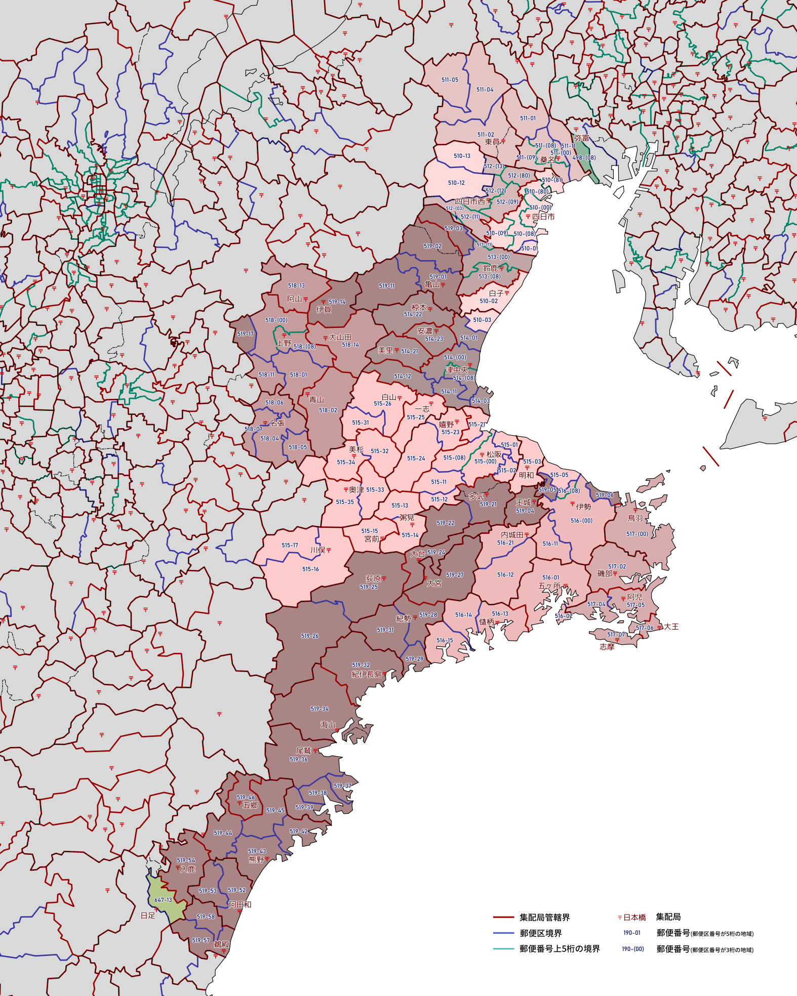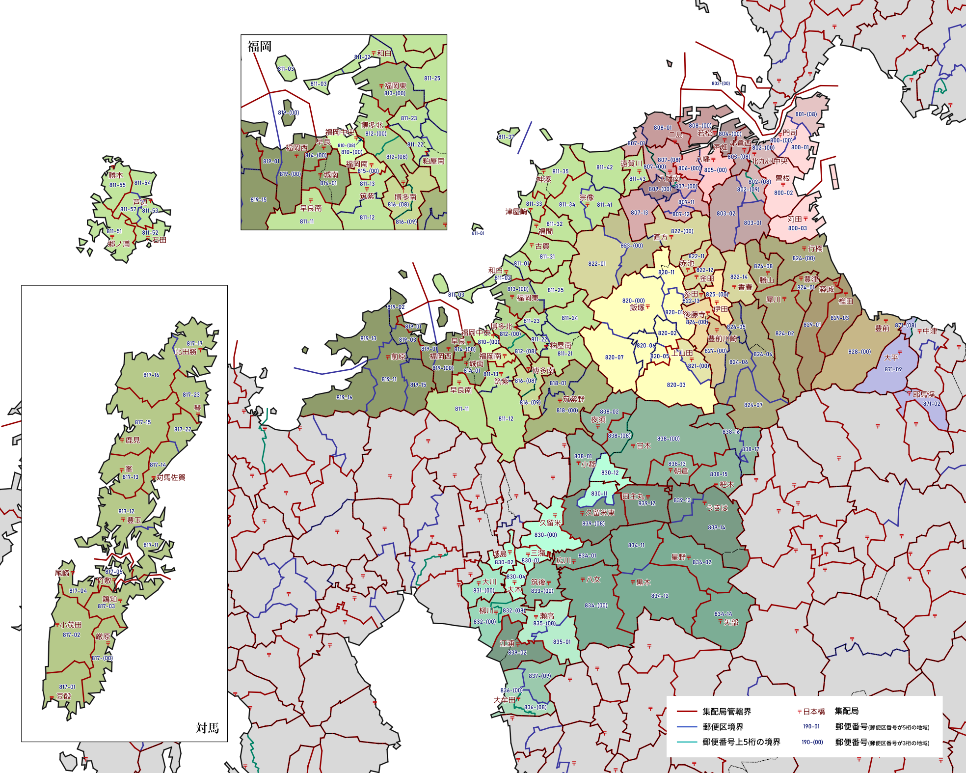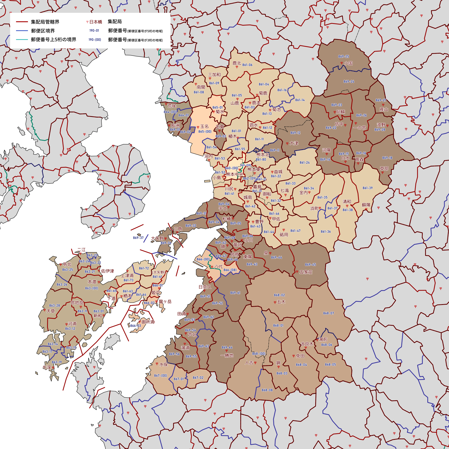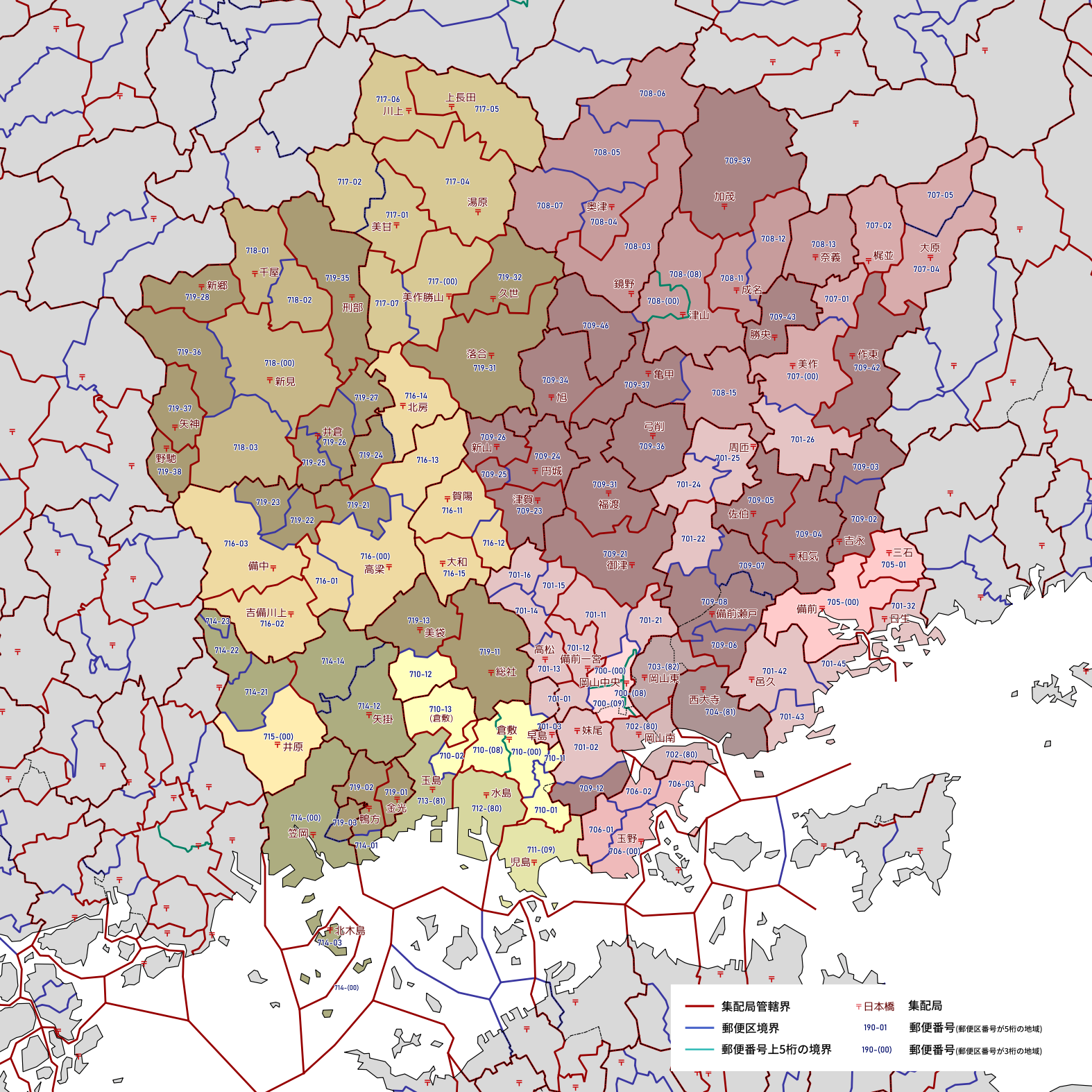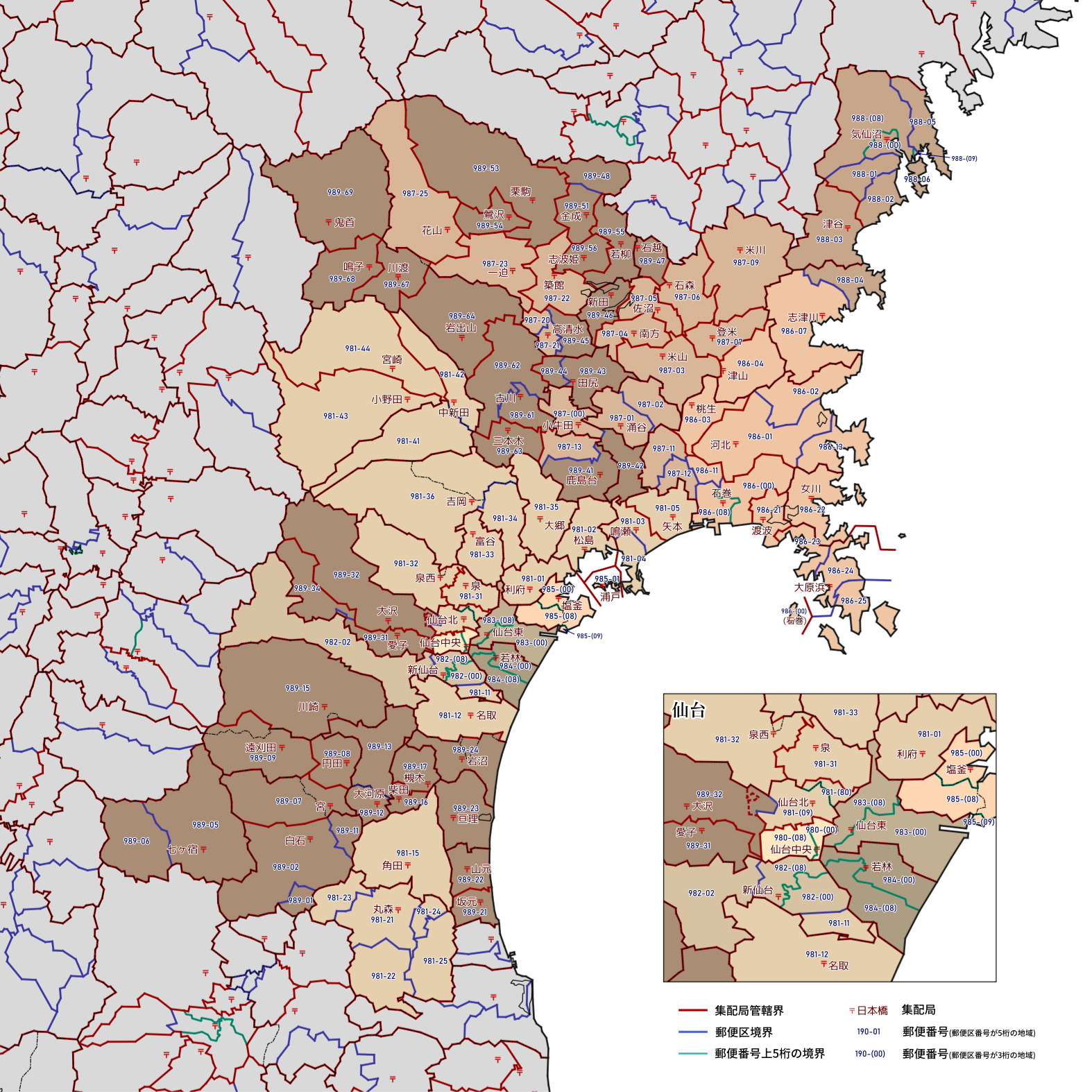 郵便番号の上5桁ごとに区分した都道府県別の地図です。